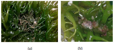 Gambar 27. Penyakit pada rumput laut (a) infeksi bakteri dan (b) infeksi jamur