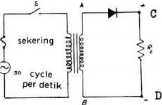 When the switch S is closed in the secondary windings will be induced alternating voltage. At the time t1 to t2 A moderate positive voltage so that the end of the half period of this diode will pass current I. This current will pass RL prisoners, so that between the ends C and D occur voltage proportional to the magnitude of the current. At the time t2 – t3ujung A negative, the diode receiving revers voltage, the current will flow RL prisoners revers, this current of only a few mikroamper (), therefore negligible, so that the ends of the RL no voltage.