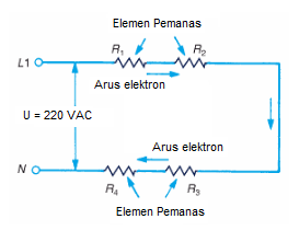– Hukum Ohm dapat digunakan untuk menghitung setiap bagian yang ada dalam rangkaian seri atau rangkaian total. Gambar 3.5 memperlihatkan rangkaian seri dengan empat resistan pemanas dengan nilai yang berbeda. Perhitungan resistan total, arus, dan tegangan jatuh pada setiap beban pemanas dapat dilakukan dengan cara berikut: