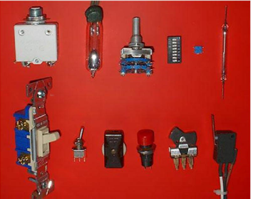 Atas, dari kiri ke kanan: Circuit Breaker, Mercury Switch, Wafer Switch, DIP Switch, Surface Mount Switch, Reed Switch. Bawah, dari kiri ke kanan : Wall Switch, Miniature Toggle Switch, In-Line Switch, Push-Button Switch, Rocker Switch, Micro Switch.