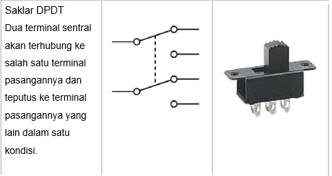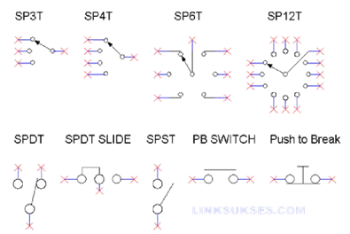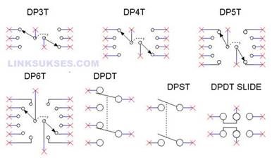 - DPXT (Double Pole X Throw) x=jumlah Throw, misalnya DP4T (Double Pole 4 Throw)