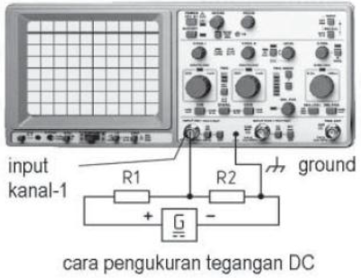 Tahanan R1 dan R2 berfungsi sebagai pembagi tegangan. Ground osiloskop dihubung kan ke negatip catu daya DC. Probe kanal-1 dihubungkan ujung sambungan R1 dengan R2. Tegangan searah diukur pada mode DC.