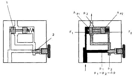 Cairan hidrolik dengan tekanan p1 akan mengangkat popet kones sehingga cairan dapat mengalir . Agar tekanan p1 dapat mengangkat popet maka p1> p2 + pF