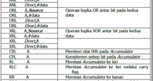 Keluarga MCS-51 memiliki 111 perintah dengan 49 buah tipe perintah single-byte, 45 buah tipe perintah dua-byte, dan 17 buah tipe perintah tiga-byte. Perintah ini dapat dikelompokkan dalam empat kelompok berdasarkan fungsinya. MCS-51 memiliki instruksi dengan jumlah yang cukup banyak. Instruksi-instruksi tersebut dapat dimasukkan ke dalam beberapa golongan . Daftar kelompok tersebut dapat dilihat pada table di bawah ini: 1. Instruksi ...