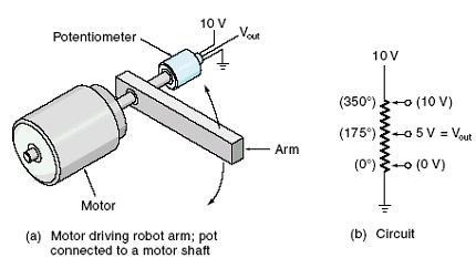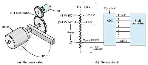 Robot arm on the picture below. rotating 120 ° stop to stop and potentiometer used as position sensor. The controller is an 8 bit digital system and needs to know the current position with a resolution of 0.5 °