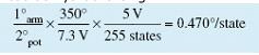 For example when the robot arm rotates 10 ° then potentiometer will rotate 20 °. And the potentiometer voltage is: 20 ° x (5 V / 350 °) = 0.29 V. This voltage will be converted by ADC into digital quantity: 0.29 V x (255 / 5V) = 14.8 ≈15 = 0000