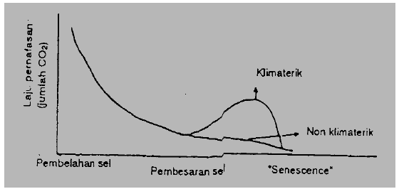 In this figure, it appears that the amount of CO2 emitted will continue to decline, then at the approach of “senescence” CO2 production again increased, and then decreased again. Fruits that do that kind of respiration is called klimaterik fruit, while the fruits that the amount of CO2 produced continues to decline slowly until the time of senescence called nonklimaterik fruit.