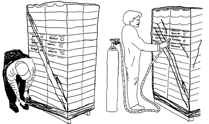 Untuk suatu pallet: Satu muatan palet produk seperti stroberi dapat di tutup dengan 5 milkantong plastik polyethylene dan helai atau lembar plastik pada dasar pallet menggunakan pita perekat lebar. Selanjutnya, kemasan dibuat vakum dan dan dimasukkan sedikti CO2 15% melalui selang kecil.