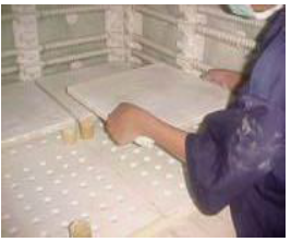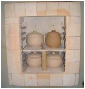 d. Susunlah benda keramik yang telah dikelompokkan ke dalam tungku dengan jarak yang cukup. Usahakan jarak antara benda memungkinkan sirkulasi panas menyebar merata dalam ruang bakar secara seimbang. Setelah plat terisi penuh kemudian plat berikutnya disusun untuk meletakkan benda lainnya, begitu seterusnya hingga ruang tungku terisi penuh, pertimbangkan sirkulasi api dan tata letak benda.