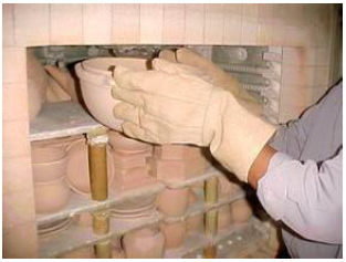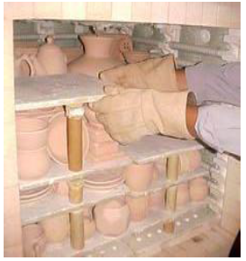 b. Angkat benda keramik satu persatu dari dalam tungku pembakaran. Mulailah dari sap atau tingkat atas, kemudian turunkan satu persatu letakkan di rak dorong dan pindahkan pada tempat yang semestinya.